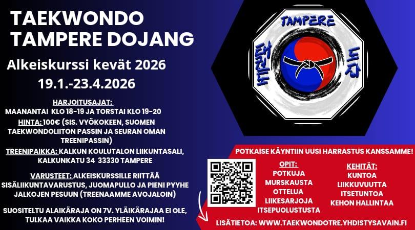 Täytä alla oleva lomake niin pääset ilmoittautumaan syksyn alkeiskurssille joka alkoi ma 19.1.2026. Kurssin hinta on 100€ joka sisältää vyökokeen, Suomen taekwondoliiton passin ja treenipassin. Harjoituspaikkana toimii Kalkun koulutalon liikuntasali, Kalkunkatu 34.